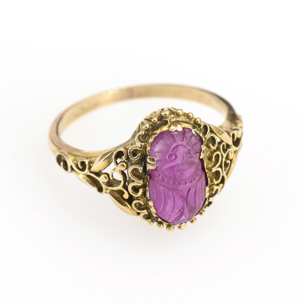 Als Skarabäus geschnittener Stein, in verziertem Ringkopf zwischen schmaler Schiene.