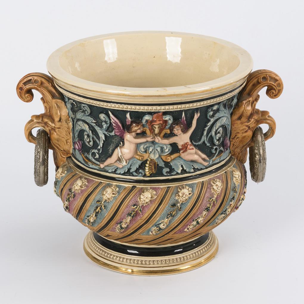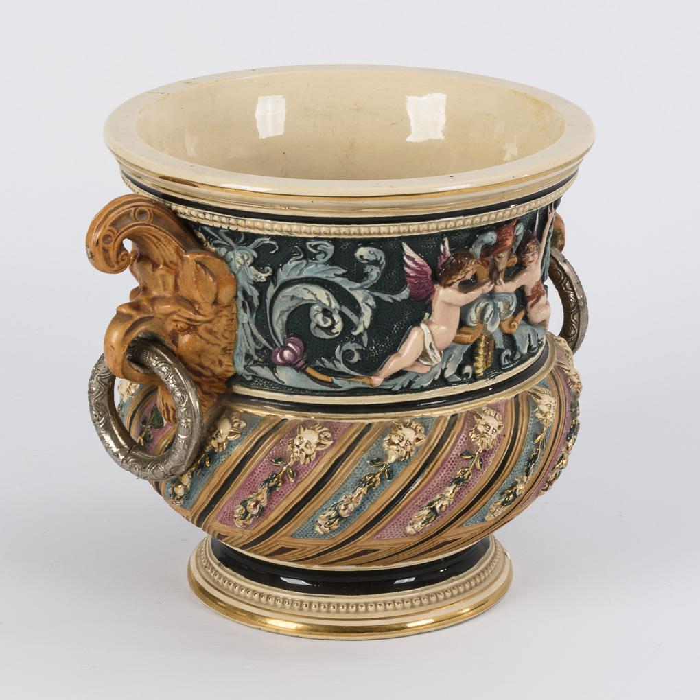 Cachepot mit historistischem Reliefdekor und 2 Greifenkopf-Ringhandhaben.