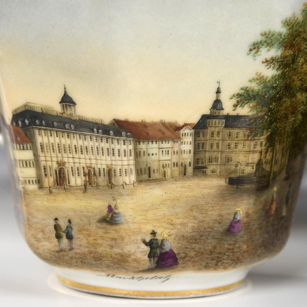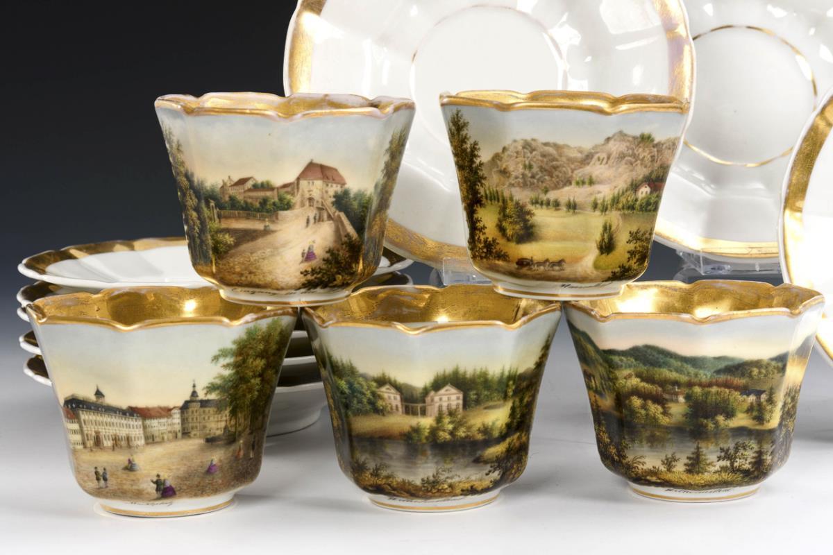 Oktogonal-konische Tassen mit spitz geschweiftem Henkel. Schauseitig jeweils eine bezeichnete Ansicht von Thüringen (Eingang der Wartburg, Eisenach mit Wartburg, Marktplatz Eisenach, Drachenschlucht Annathal, Schloss Wilhelmsthal, Schweizerhäuser Wilhelmsthal, Marienthal). Partieller Goldabrieb, Haarriss in 1 Untertasse und 1 Tasse.