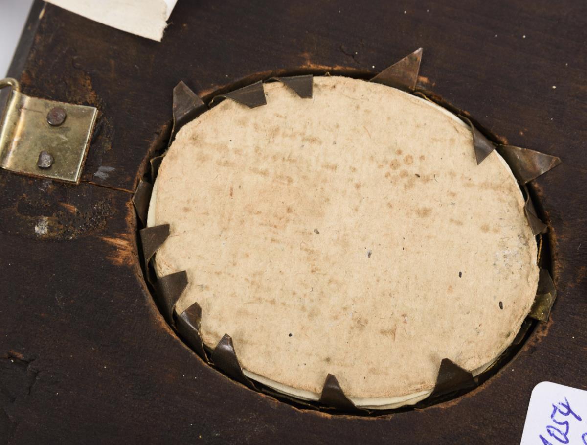 Gouache auf Pergament, verglaster dunkelbrauner Holzrahmen. 5,5 x 4,5 cm, Rahmen 11 x 10 cm.