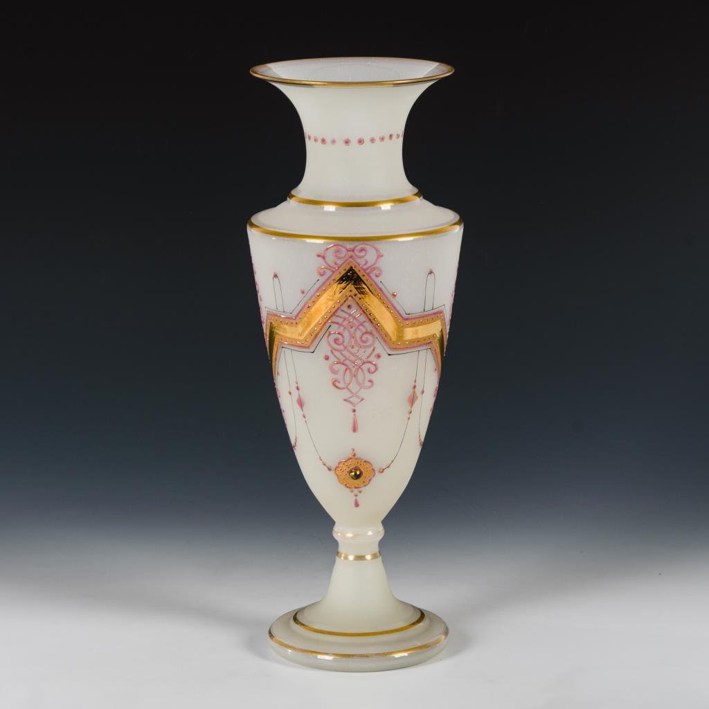 Weißes, mattiertes Alabasterglas, Reliefmalerei in Gold und Rosa, aufgesetzte Glascabochons.H 38 cm.