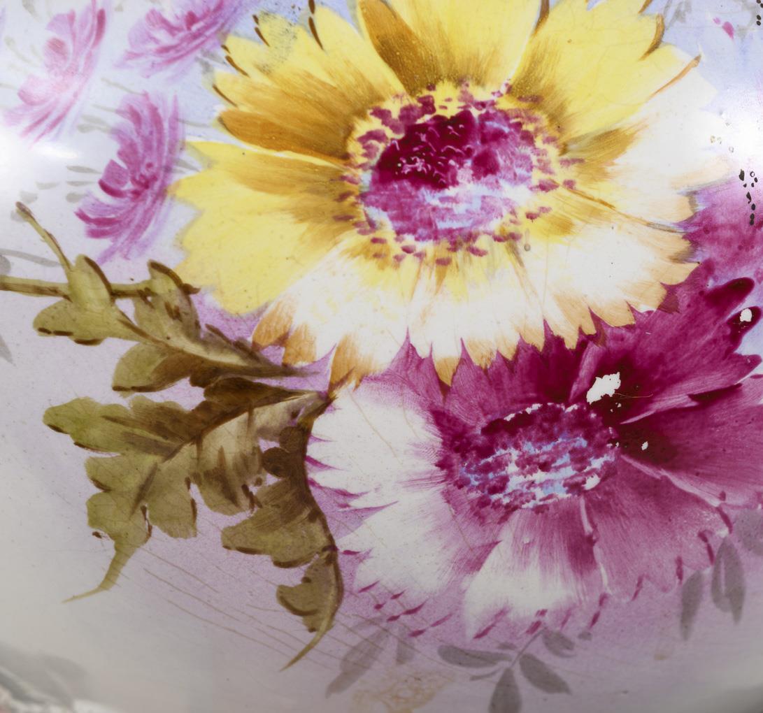 Steingut, Fond in Weiß und Rosé, farb- und goldstaffiert. Gesamt H 103,5 cm | Topf H 24,5 cm, Ø innen 29 cm, Zwischenteller H 5 cm, Schaft H 59 cm, Sockel H 18 cm.