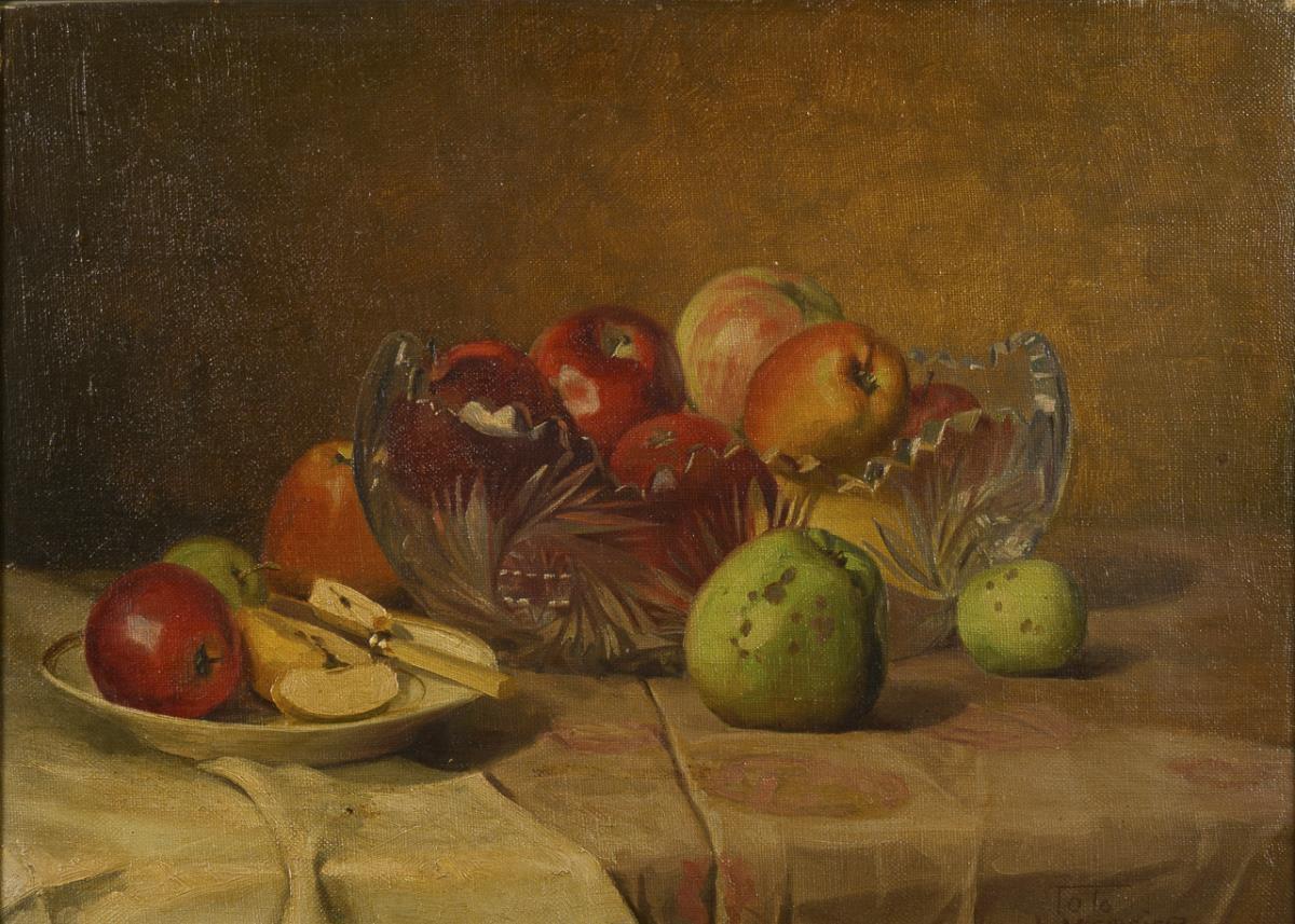 Äpfel in einem Weidenkorb neben Weinglas und Keramikgefäß sowie Äpfel in einer Glasschale und auf einem Teller.
