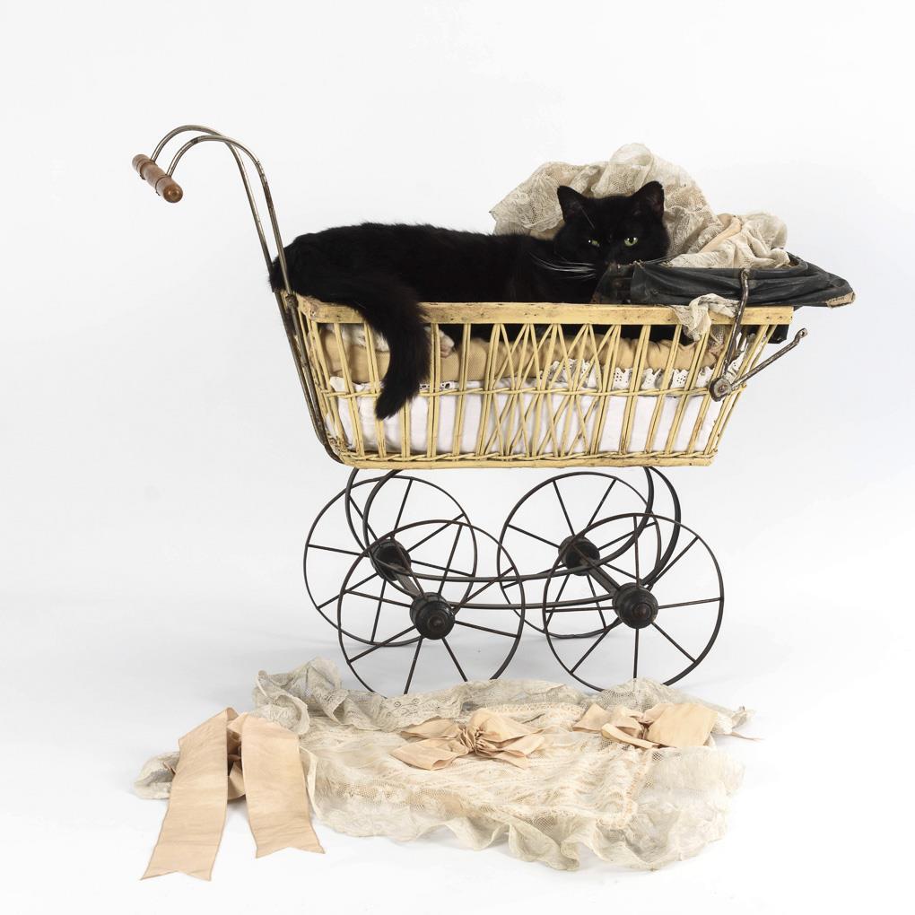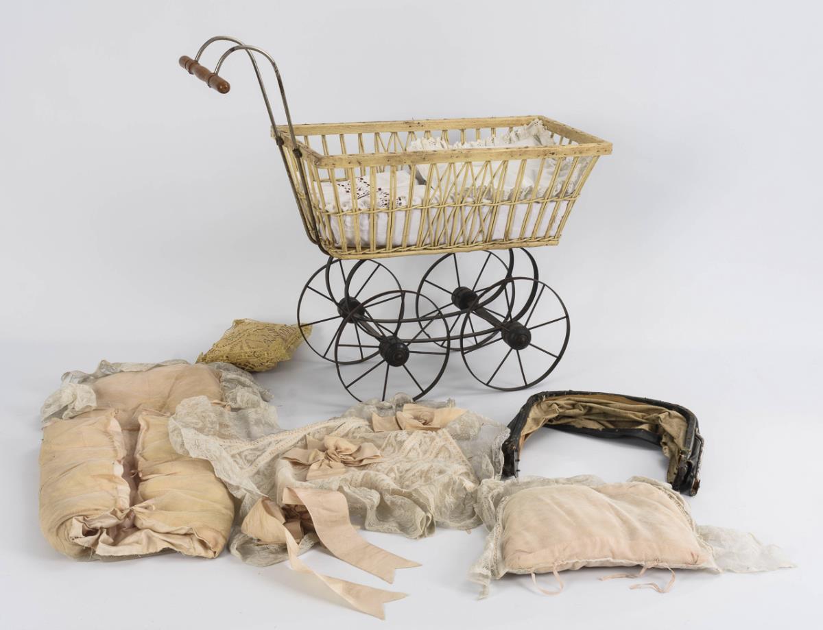 Weiß gestrichener Korbwagen, defektes Waschtuchverdeck, Eisengestell mit Speichenrädern. Mit alter Wäsche und Kissen. Altersspuren und Defekte.