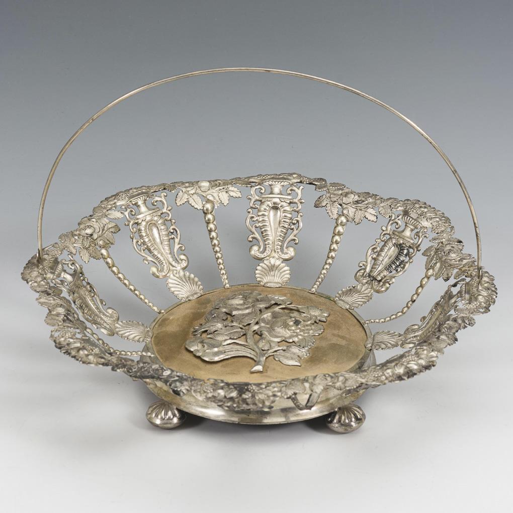 Runde Durchbruchschale mit Rosen- und Vasenmotiven. Schlichter Drahthenkel. Kleine Defekte, alte Reparaturstellen.