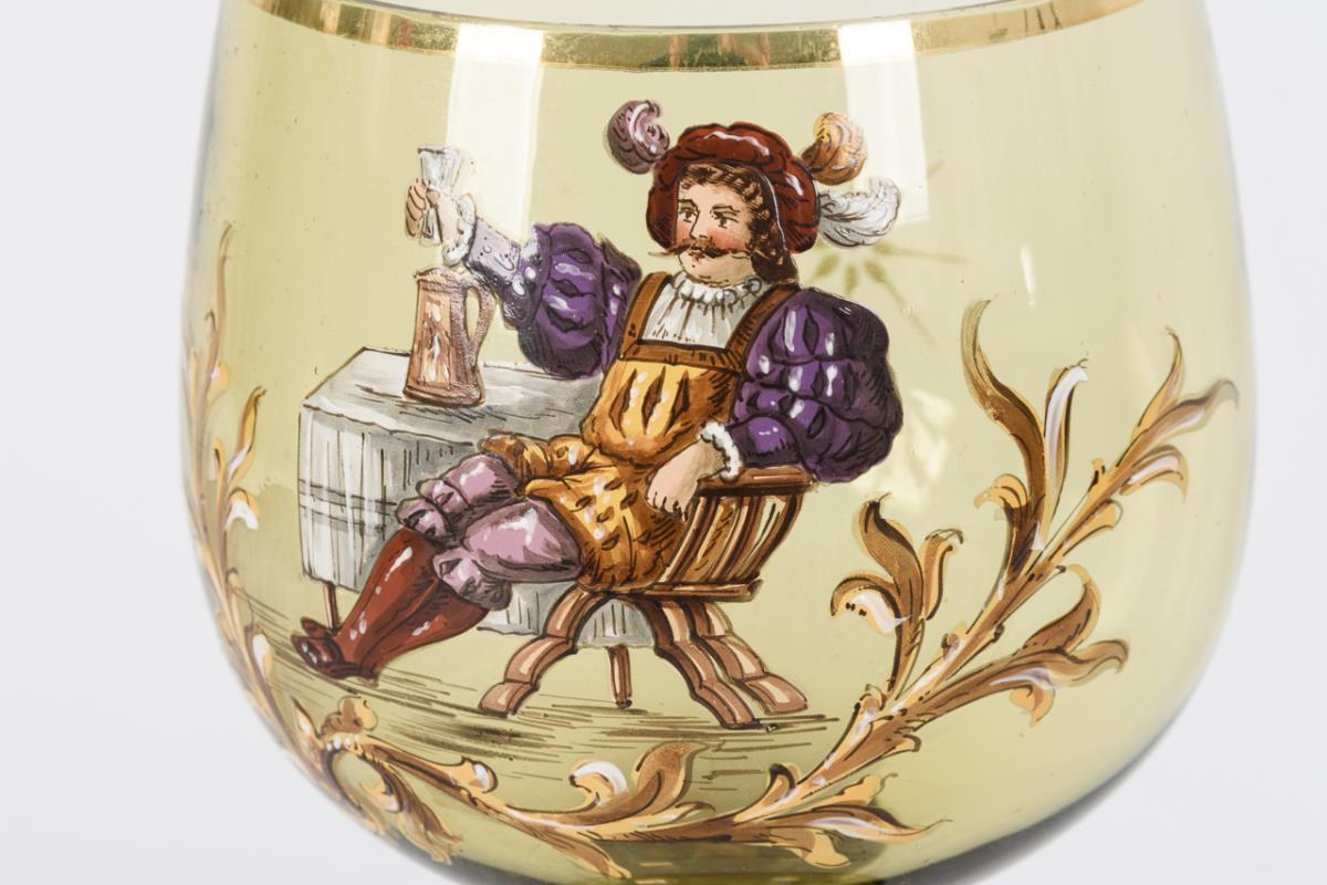Bauchige Kuppa, gerillter Schaft, Rundfuß. Schauseitig die Darstellung eines weintrinkenden Edelmannes an einem Tisch. Partieller Goldabrieb, minimale Randbestoßungen, Bestoßungen am Fußrand.