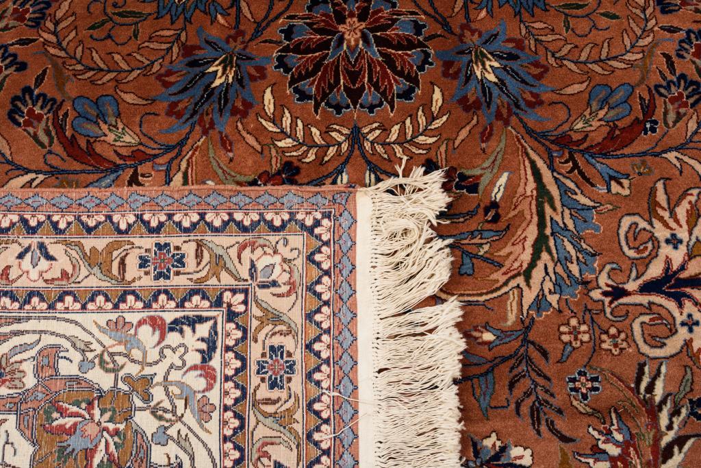 Baumwolle und Wolle, feine Handknüpfung. Polychromdekor mit vorwiegend Braun, Blau und Elfenbein.300 x 425 cm.