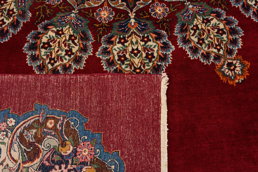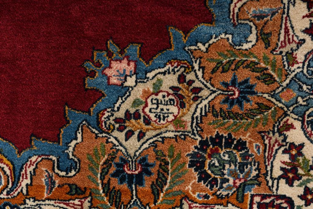 Großes 16-teiliges Sternmedaillon mit zwei hängenden Ölampeln auf kirschrotem Fond. Außergewöhnliche florale Bordürengestaltung mit geschweiften Rändern in Anlehnung an die Konzepte von Wolkenkragen und Himmelspforte. In den Zwickelfeldern persisch bezeichnet und datiert. Defekte Fransenabschlüsse.