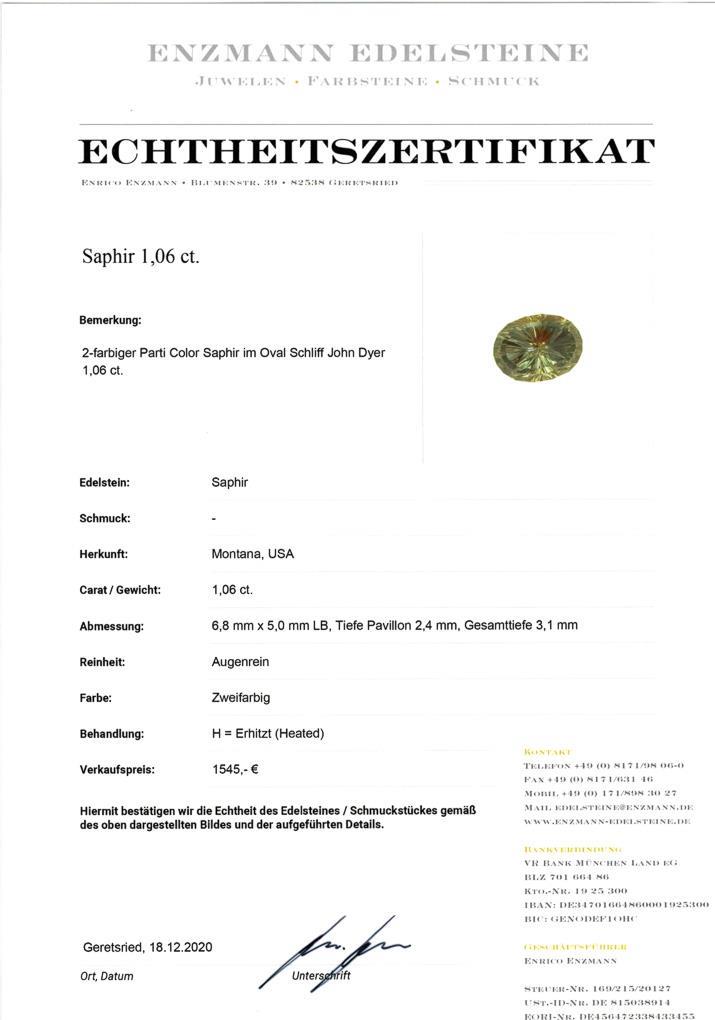 Ungefasster, 2-farbiger Saphir mit Zertifikat.