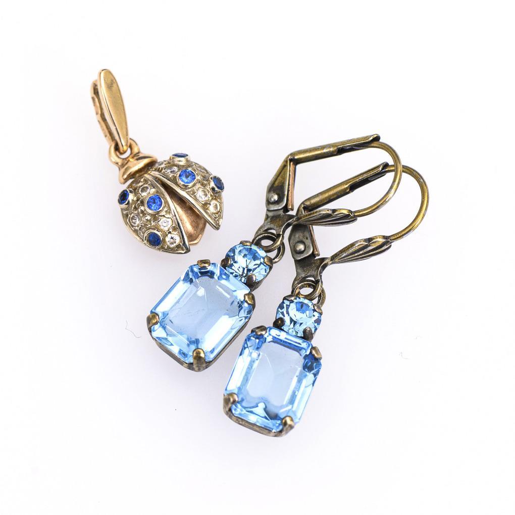 Kleiner Marienkäferanhänger mit blauen und farblosen Steinen. Ohrhängerpaar mit abgehängten Imitationen. Metallfassung und -federbügel.