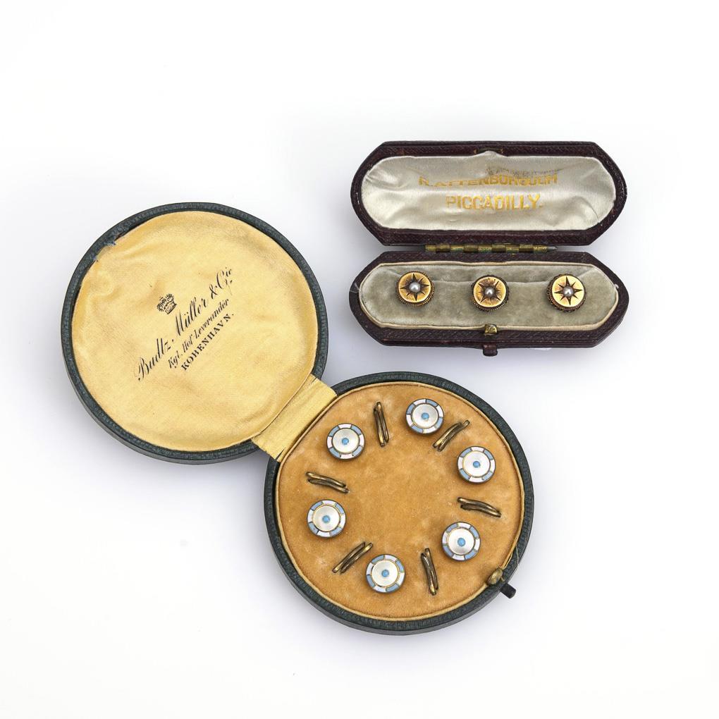 6 Knöpfe mit Permutt und emaillierten Rändern, in grünem Originaletui "Kobenhaven". 3 Knöpfe mit kleinem Halbperlchen in braunem Etui "R. Attenborough Piccadilly".