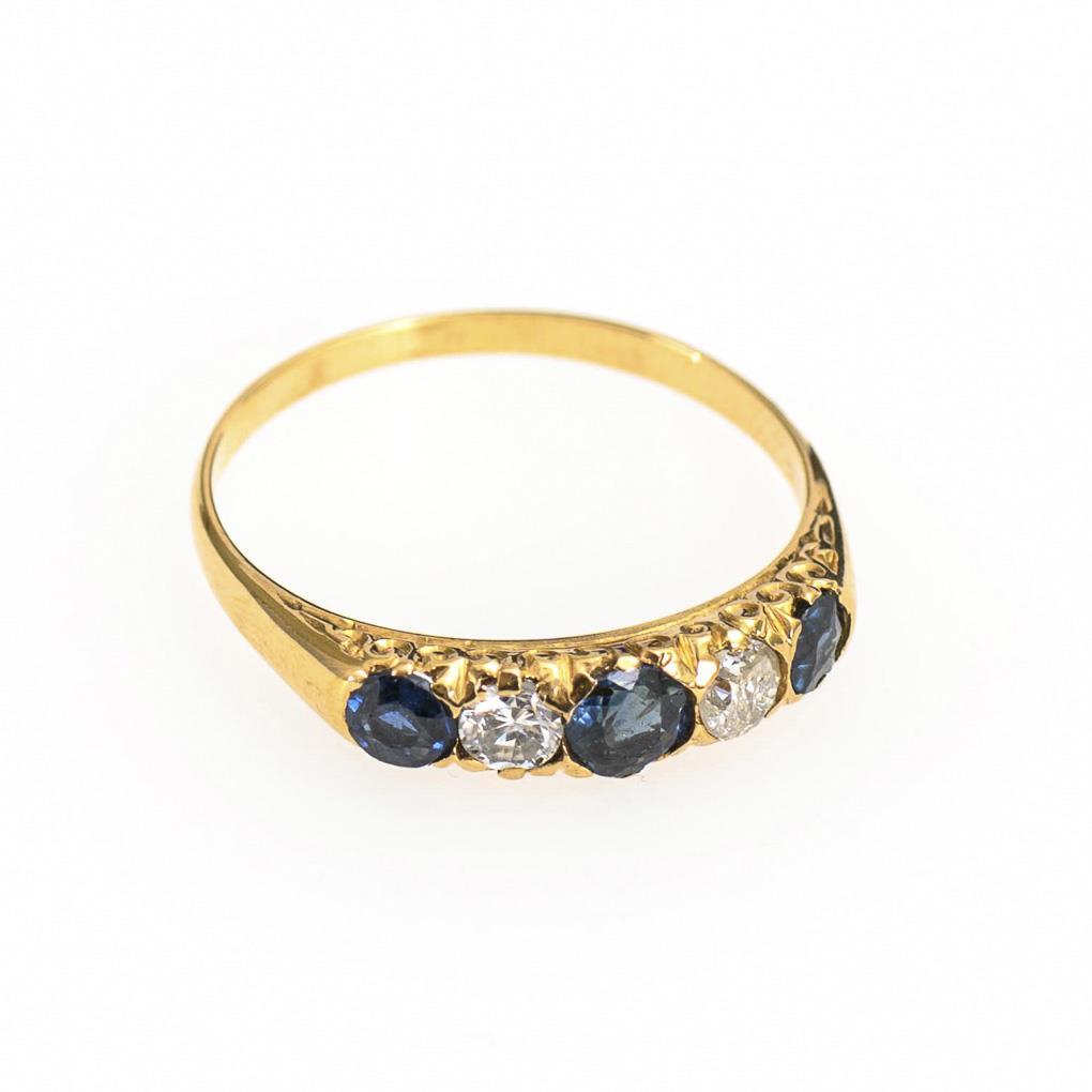3 Saphire und 2 Altschliff-Brillanten zwischen schmaler Schiene.