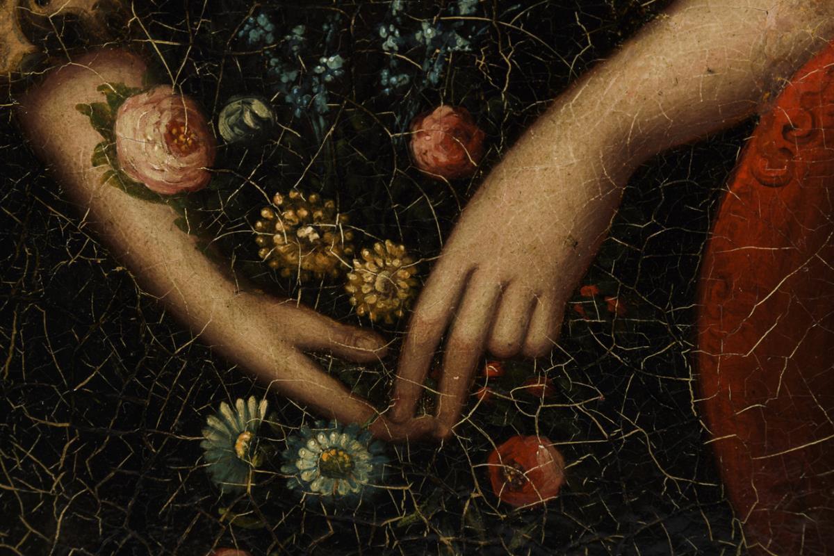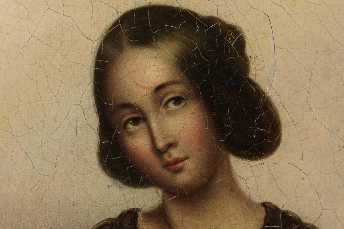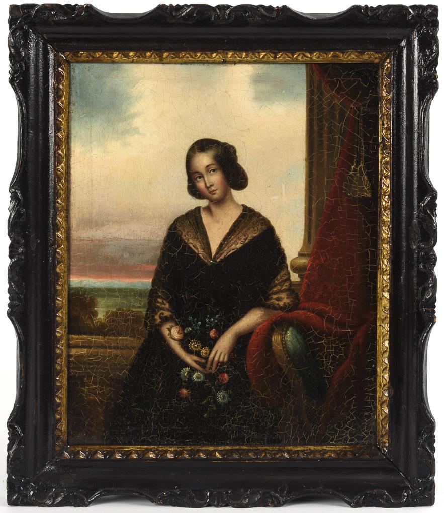 Qualitätvoll gemaltes Kniestück der jungen Frau neben dem Vorhang an der Säule sowie Ausblick in die weite Abendlandschaft. Restauriert, doubliert, sehr stark krakeliert.