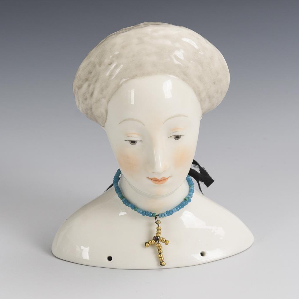 Brustkopf mit gemalten Augen und modellierten grauen Haaren. Keine Defekte sichtbar.