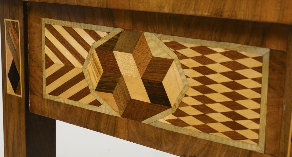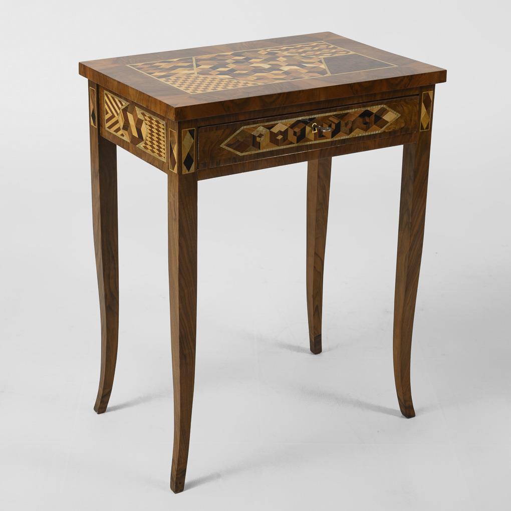 Rechteckiger Beistelltisch auf 4 leicht ausgestellten Beinen, mit glatter Zarge und 1 Zargenschub; verziert mit feiner Würfelmaketerie und geometrischen Mustern.