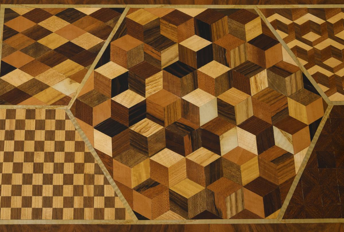Verschiedene Hölzer furniert und marketiert. Ca. 79,5 x 63 x 41 cm.