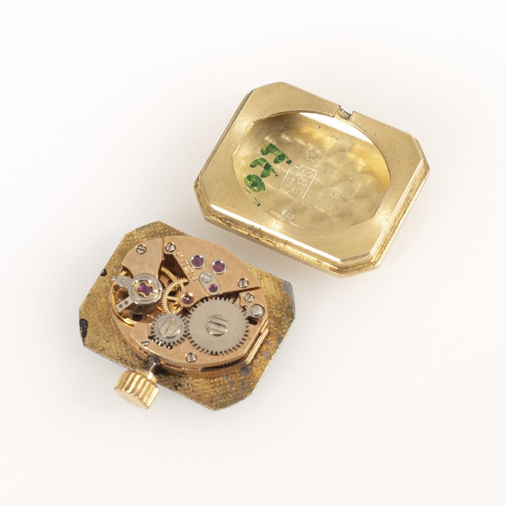 Achteckiges Gehäuse mit eingelassenen Diamantstreifen, an schwarzem Lederband mit Dornschließe aus Metall. Leichte Alters- und Gebrauchsspuren, Werk ist revisionsbedürftig, Zeigerstellung defekt.