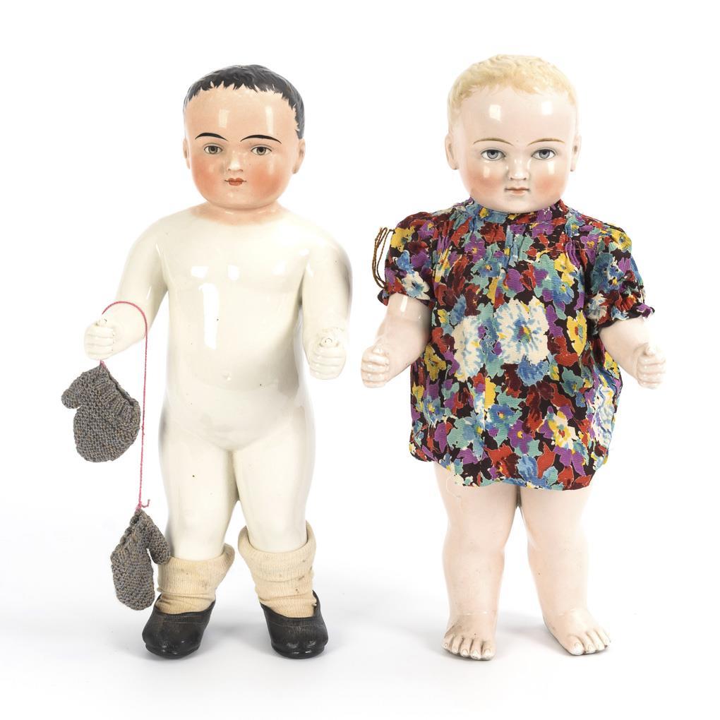 Sogenannte Nacktfrösche oder "Frozen Charlotte". 1x rosa getönt mit blonden Haaren, 1x mit rosa getöntem Gesicht und schwarzen Haaren. 1x mit Schuhen, Strümpfen und Handschuhen bekleidet, 1x mit buntem Sommerkleid. Eine Puppe mit minimalen Chips an den Fersen und 1 Haarriss in der Glasur am Bein.
