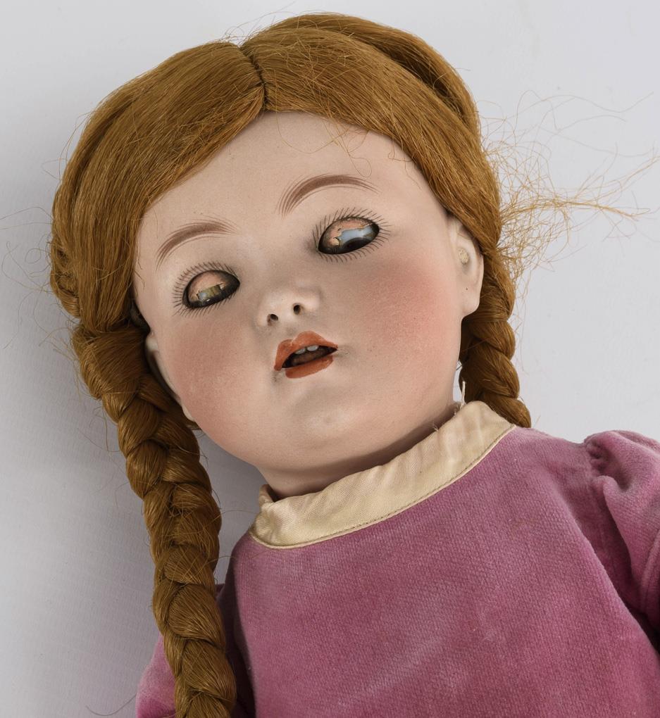 Kurbelkopf, braune Schlafaugen, offene Nasenlöcher, Flatterzunge, rotbraune Kunsthaarperücke mit Zöpfen. 17-teiliger Toddlerkörper. Rosa Samtkleid, defekte rote Wachstuchschuhe. Kopf durchleuchtet: ohne Defekte, Lider berieben. Körper mit kleinen Farbdefekten und Übermalungen.