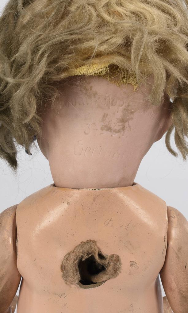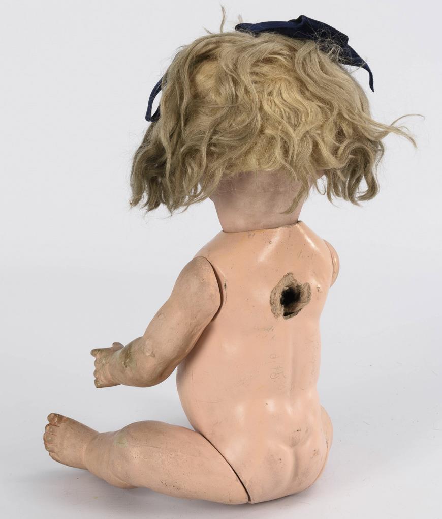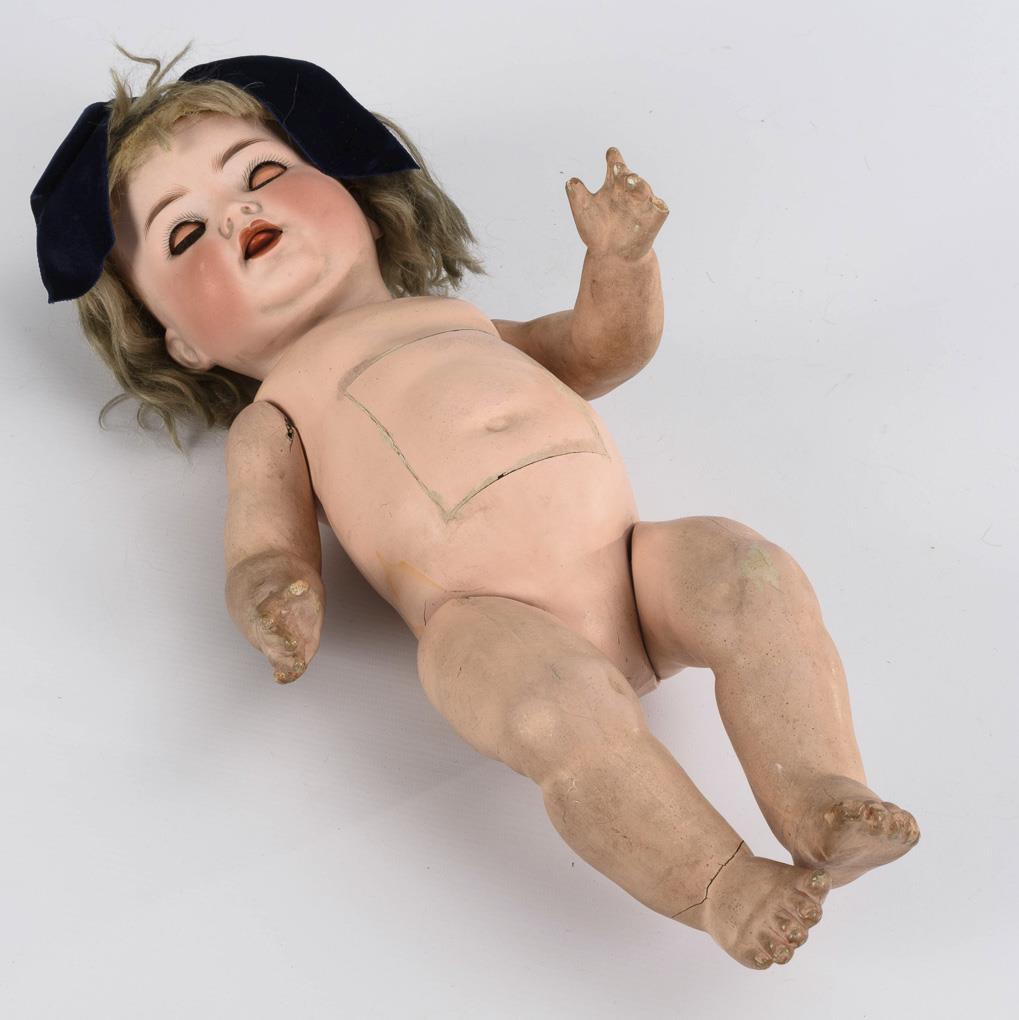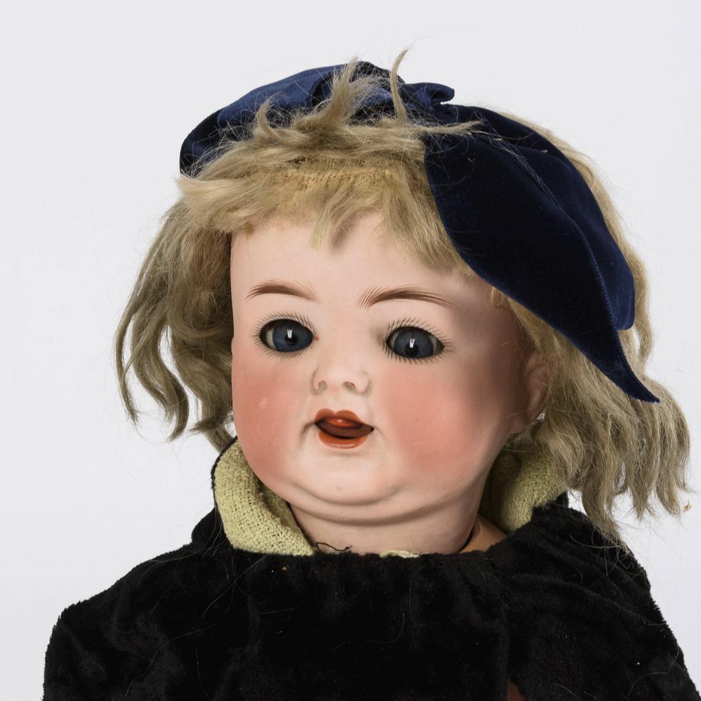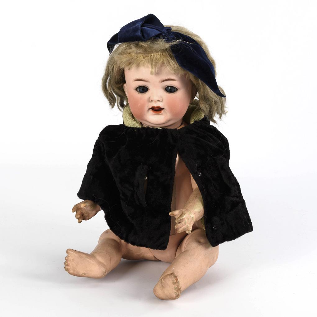 Kurbelkopf, blaue Schlafaugen, Wimpern, blonde Mohairperücke. 5-teiliger Sitzbabykörper. Bekleidet mit schwarzem Cape. Kopf durchleuchtet: ohne Defekte. Körper mit Farbabrieb und Defekten, Stimme wohl nachträglich eingesetzt (Bauchschnitt).