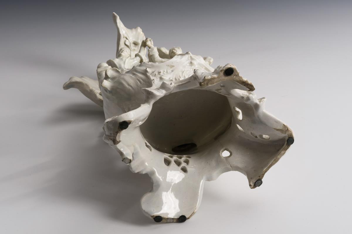 Bläulich weiß glasiert, in den Vertiefungen glasig, leicht körnig, teils kleine Einschlüsse. H 37 cm.