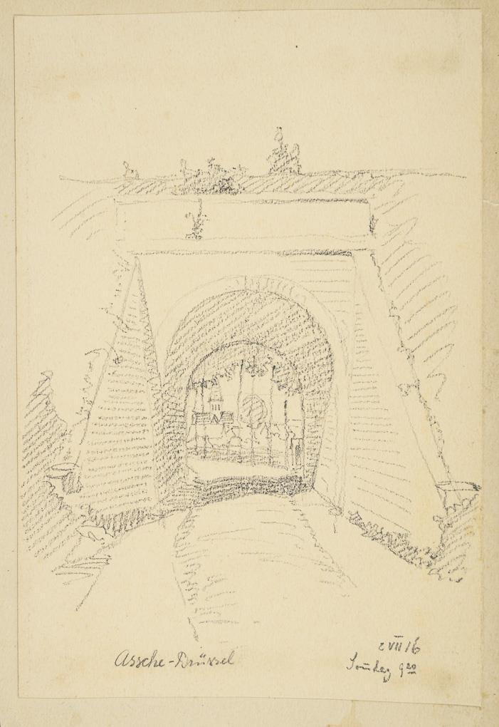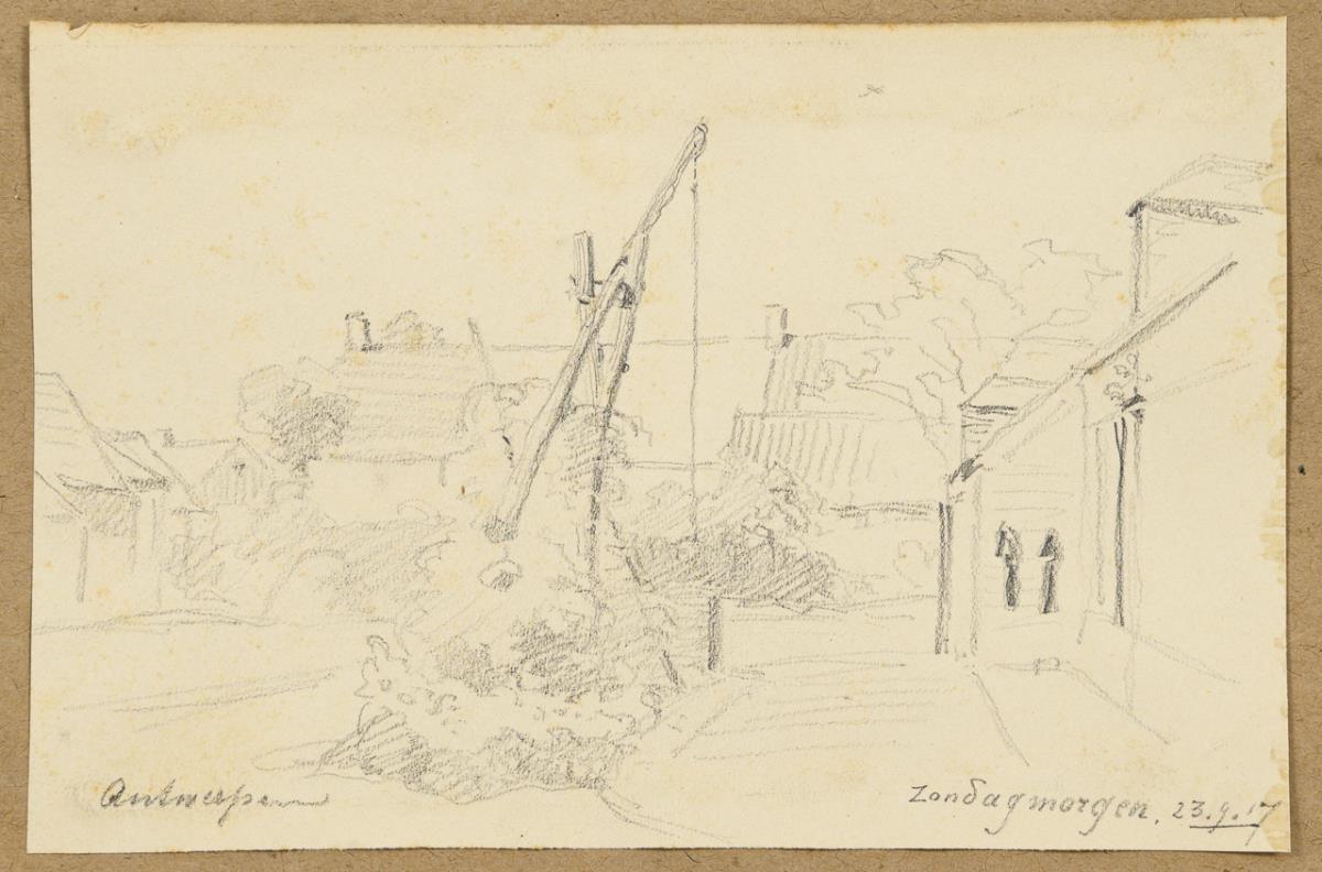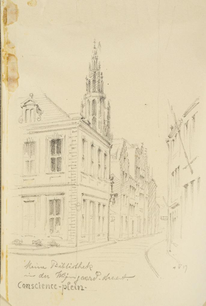 20 kleinformatige Zeichnungen mit Landschaften von Antwerpen und Umgebung, Brüssel, Streitberg, Gößweinstein und Pottenstein, teils mit Grüßen von "Karl und Heinrich" sowie Kirchenräumen, Stadtansichten und verschiedenen Studien. Teils stockfleckig und griffspurig.