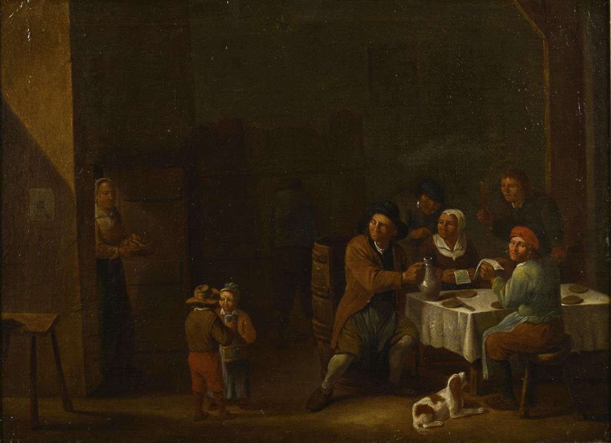Szene in der Stube mit mehreren Personen am gedeckten Tisch, daneben zwei Kinder und die eintretende Magd mit der Speise. Altersspuren.