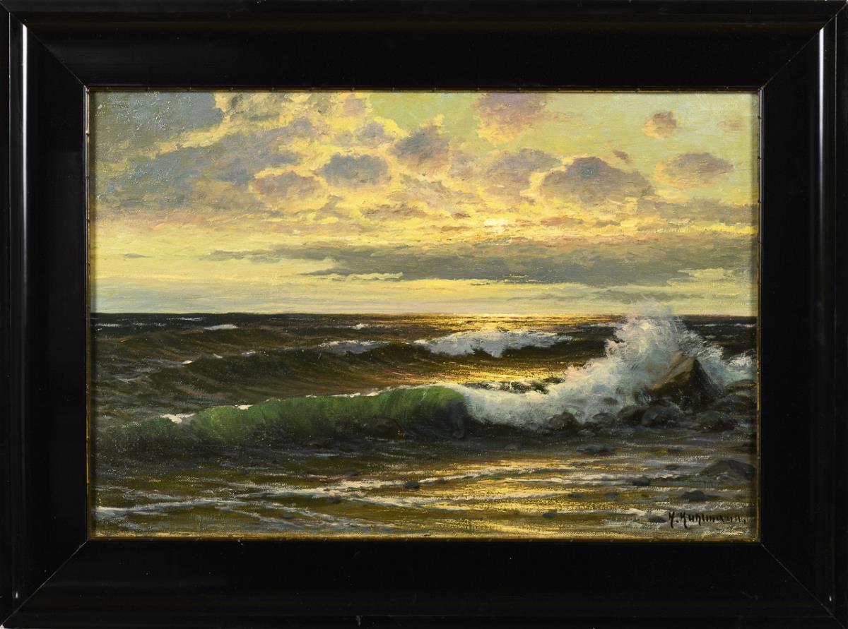 Idyllisches Sonnenlicht über dem Horizont und den Wellen am felsigen Strand. Leichte Altersspuren.