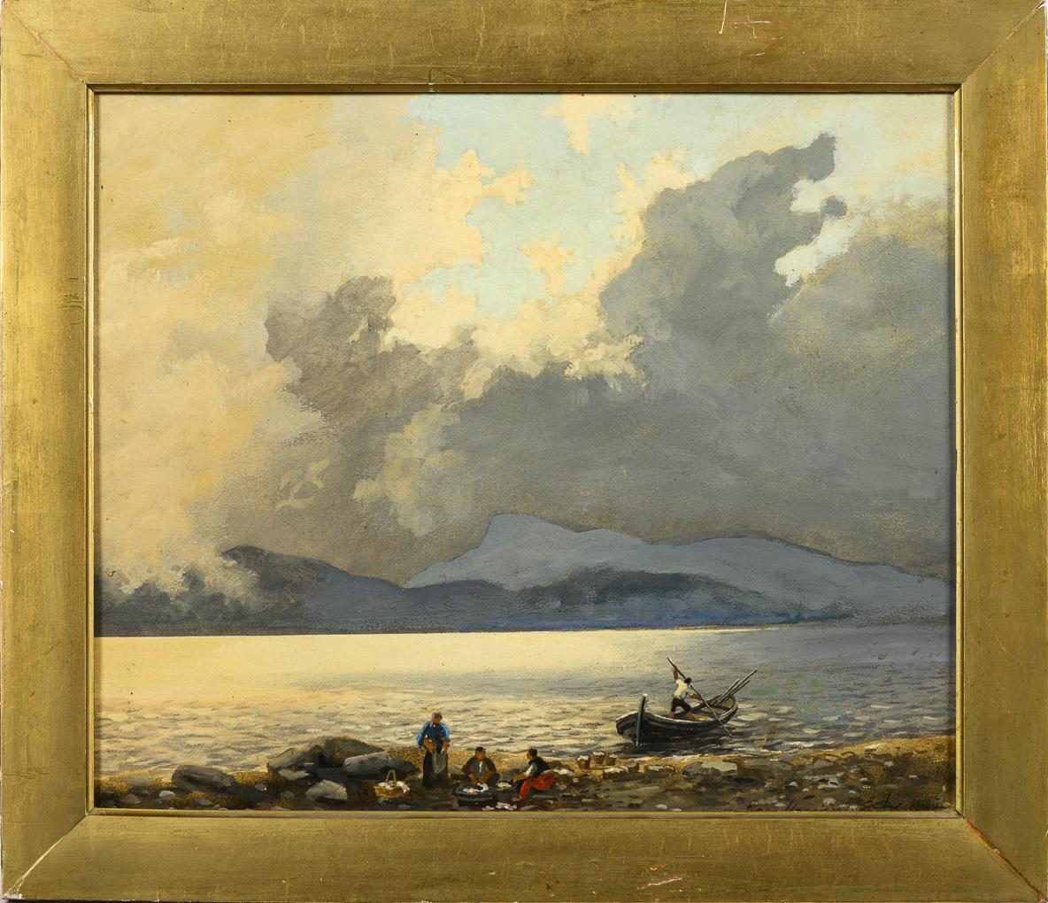 Fischer am Ufer und im Boot unter kontrastreichem Himmel. Retuschiert.
