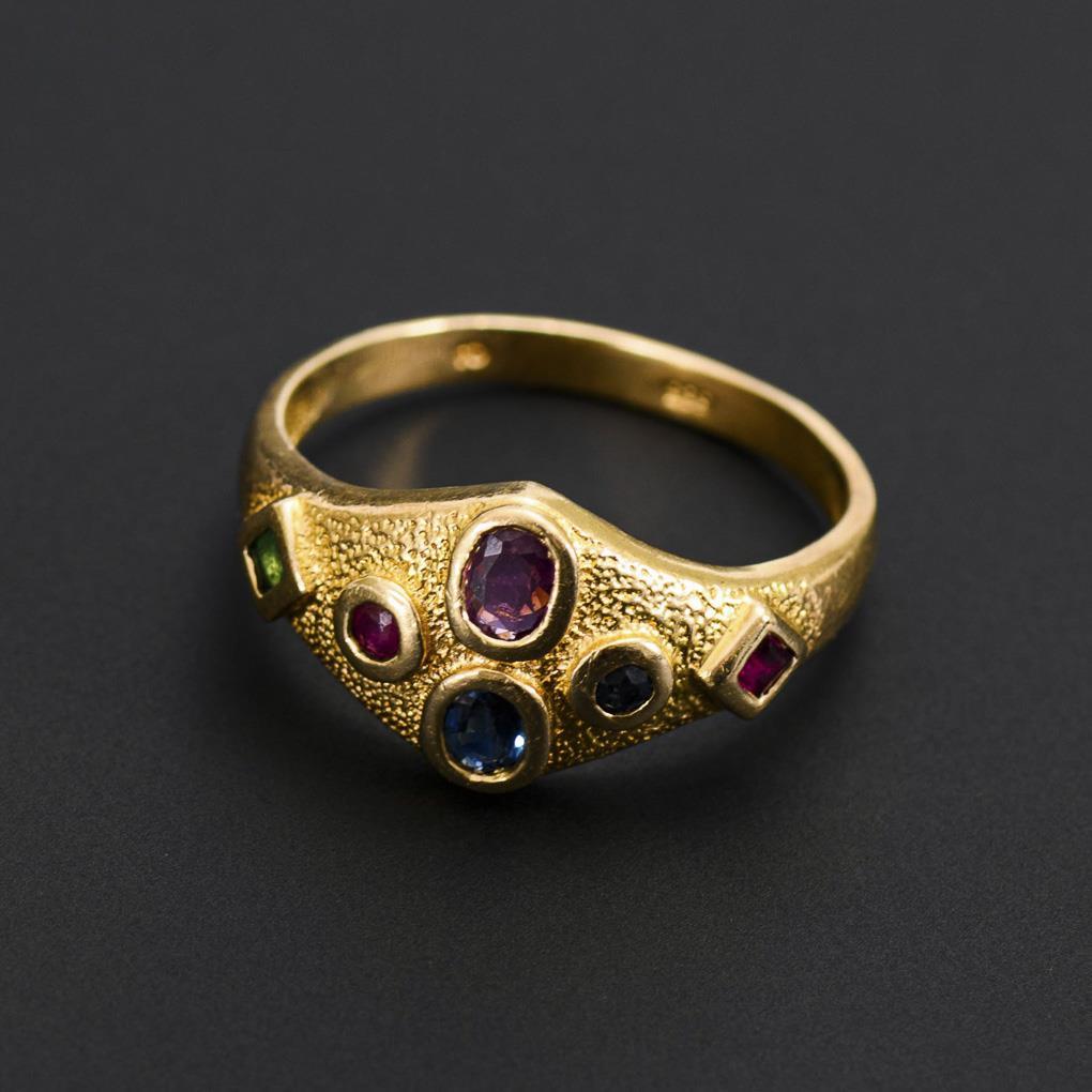 3 Rubine, 2 Saphire und 1 Smaragd in Zargenfassungen, zwischen schmaler Schiene.