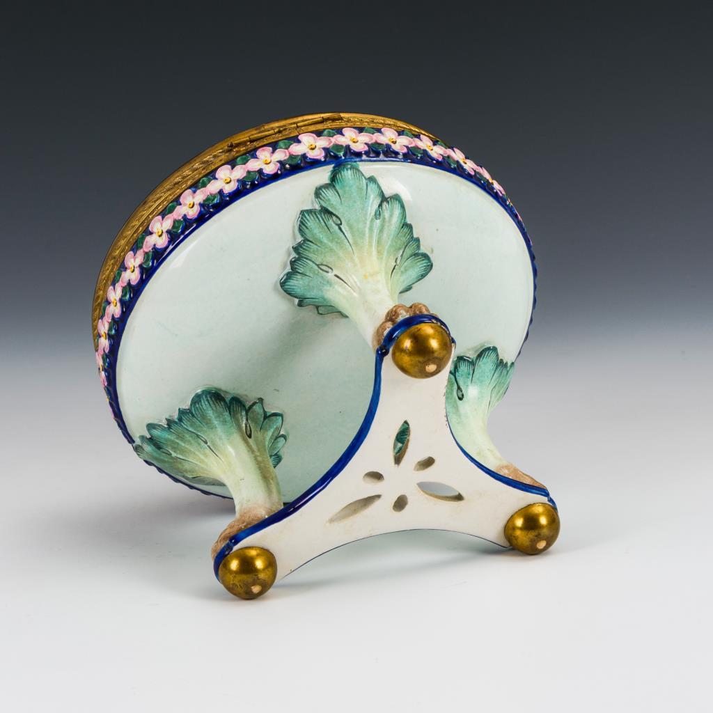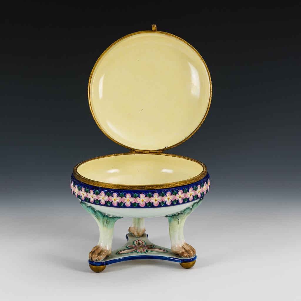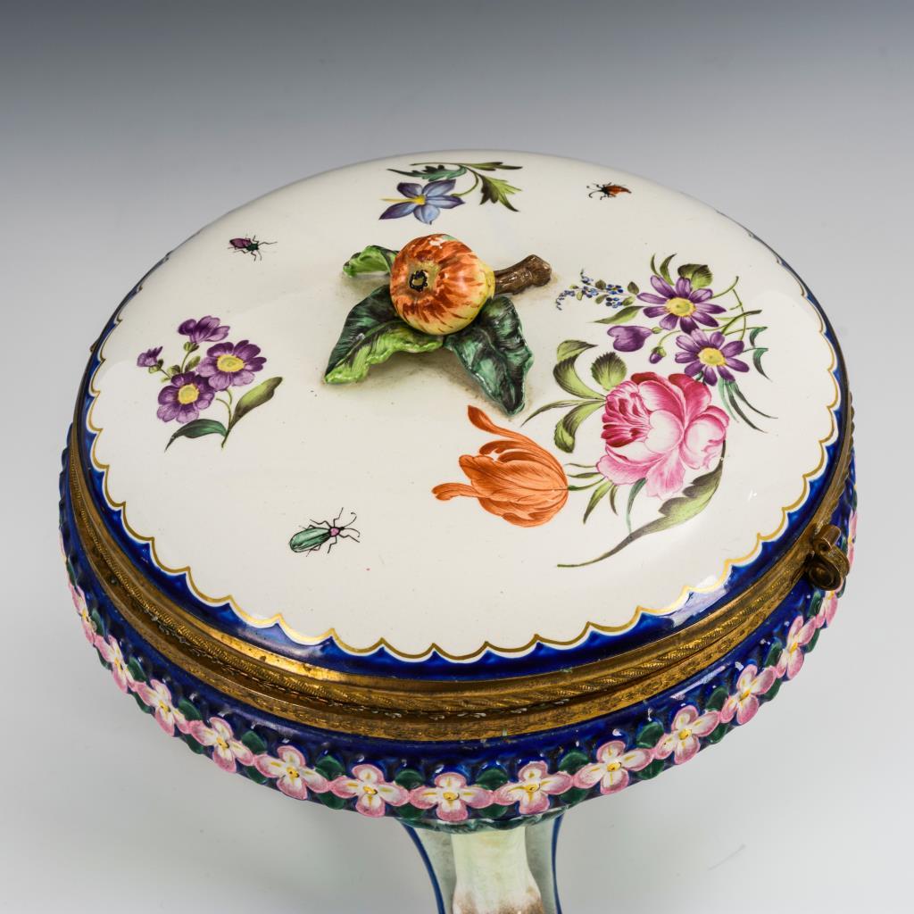 Runde Deckeldose mit bemalten Blumen und Insekten sowie einem Fruchtknauf, auf drei Tatzenbeinen und einem durchbrochenen Dreipass-Sockel mit bronzierten Halbkugelfüßen. Geprägte Messingmontierung.