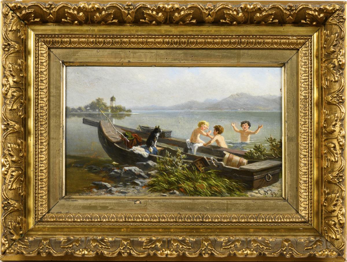 Am Steg mit Anglerboot bei klarem Sonnenlicht badende Kinder sowie Blick zur Fraueninsel. 1 feiner Haarriss, sonst minimale Altersspuren.