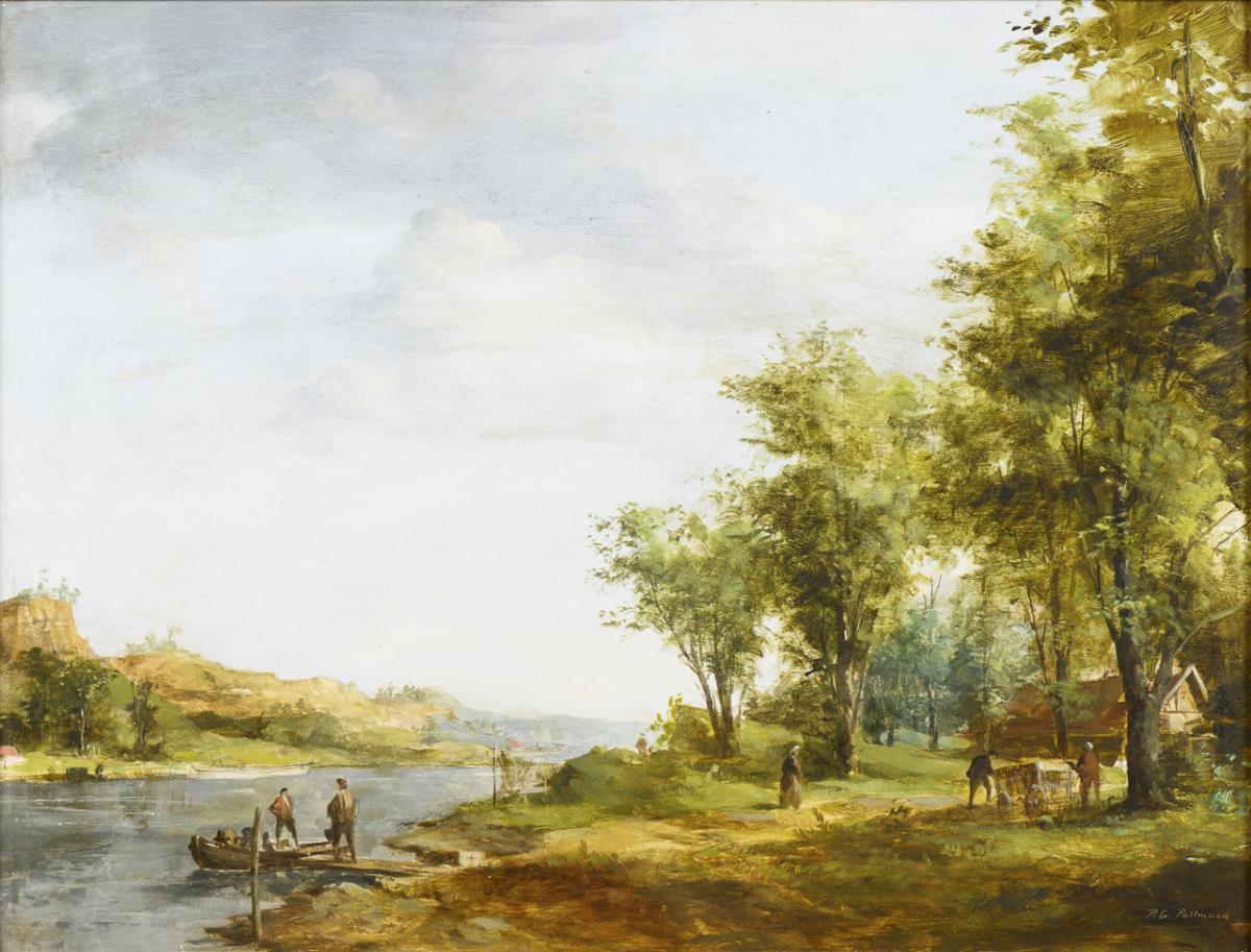 Flusslandschaft im Sonnenschein mit Staffagefiguren nahe dem Ort.