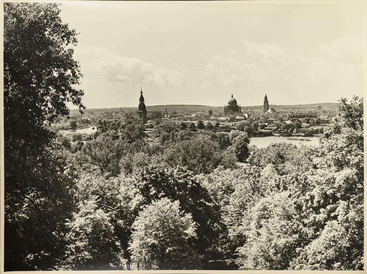 Dokumentation der Stadt Potsdam zum Ende des 2. Weltkrieges in 10 fotografischen Arbeiten, darunter Ansichten des zerstörten Potsdams: "Potsdam nach dem 14. April 1945 Kommandantur und Nikolaikirche", "Potsdam: Das Alte Rathaus", "Potsdam: Die Lange Brücke", "Potsdam: Kommandantur", "Blick a. Potsdam v. Flatowturm (im Babelsberger Park)", "Potsdam: Im Nebel a. d. Langen Brücke", "Potsdam nach dem 14. April 1945 Französische Straße", "Potsdam nach dem 14. April 1945 Altes Rathaus u. Palast Barberini", "Potsdam: Militärwaisenhaus" und "Potsdam: Alte Fahrt". Randbereich je minimal gebräunt/griffspurig und gewellt, "Potsdam: Kommandantur" mit kleinen Flecken im linken Randbereich.