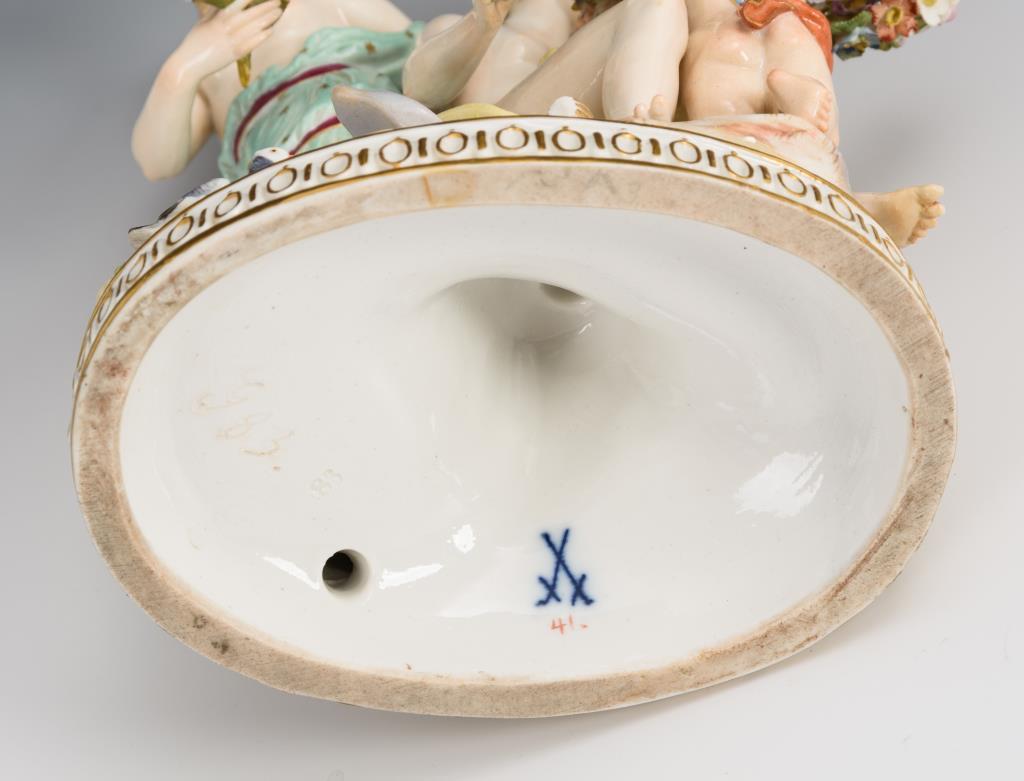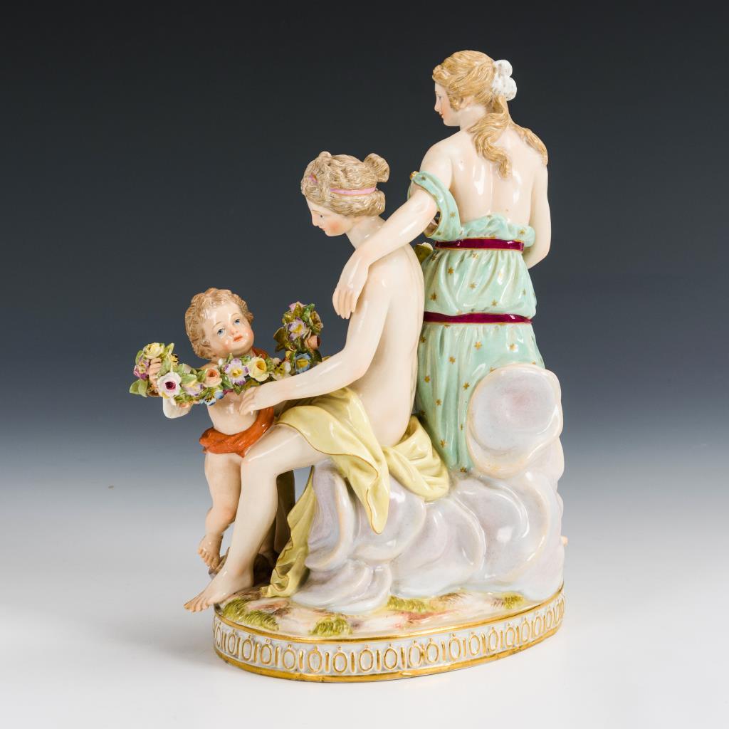 Auf einem Wolkensockel sitzende Venus mit Nymphe sowie ein Amorknabe mit Girlande. Blüten partiell bestoßen, 2 Zehen der Venus sowie vereinzelt Blütenblätter restauriert.