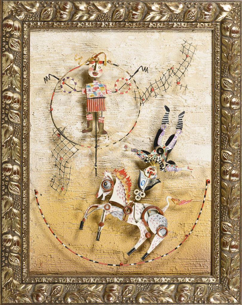 Mischtechnik mit figürlichen Metallapplikationen. Verso signiert/betitelt. Verso datiert: 2005.