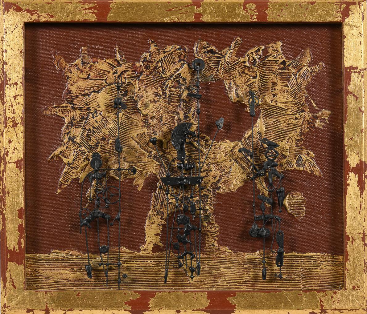 Mischtechnik mit figürlichen Metallapplikationen. Verso signiert/betitelt. Verso datiert: (19)98.