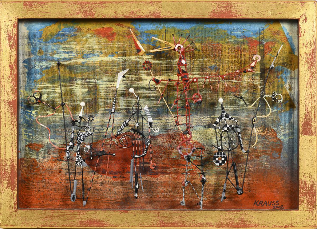 Mischtechnik mit figürlichen Metallapplikationen. Rechts unten signiert, verso betitelt. Datiert: 2002.