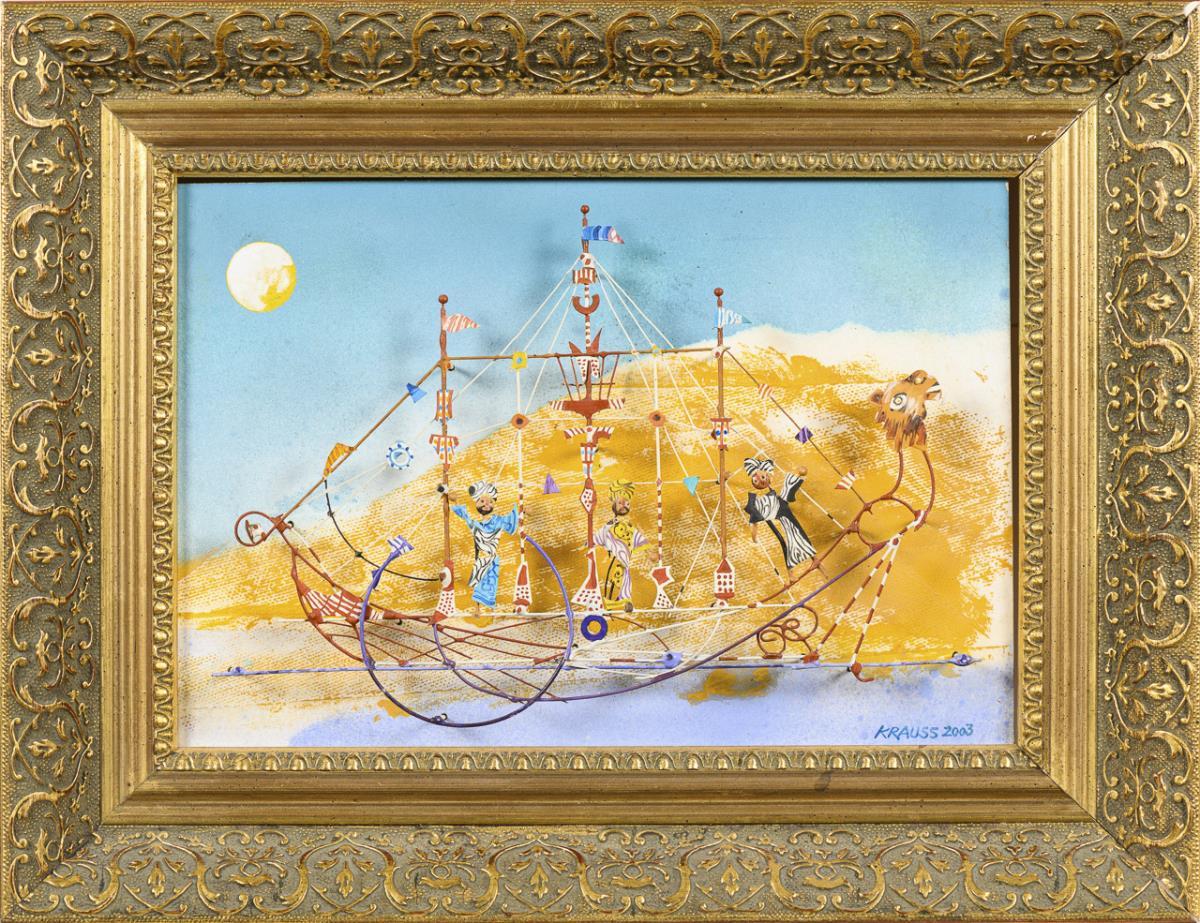 Mischtechnik mit figürlichen Metallapplikationen. Rechts unten signiert, verso bezeichnet/betitelt. Datiert: 2003.