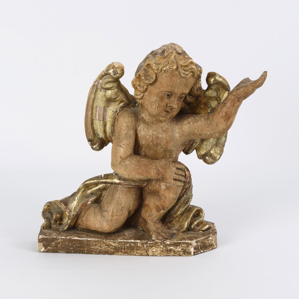 Auf der Plinthe kniender Putto mit emporweisender linker Hand. 1 Daumen und wenige Fingerspitzen fehlen, Fassung entfernt, Abplatzer an der Stuckierung.