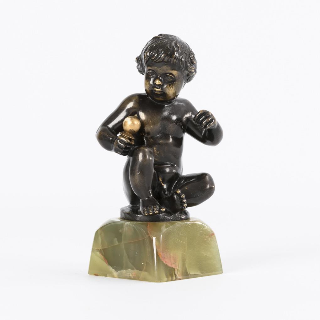 Auf dem Boden sitzender Knabenakt. Patina berieben, Kugel ergänzt, minimale Chips am Sockel.