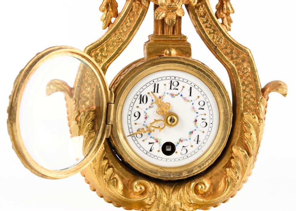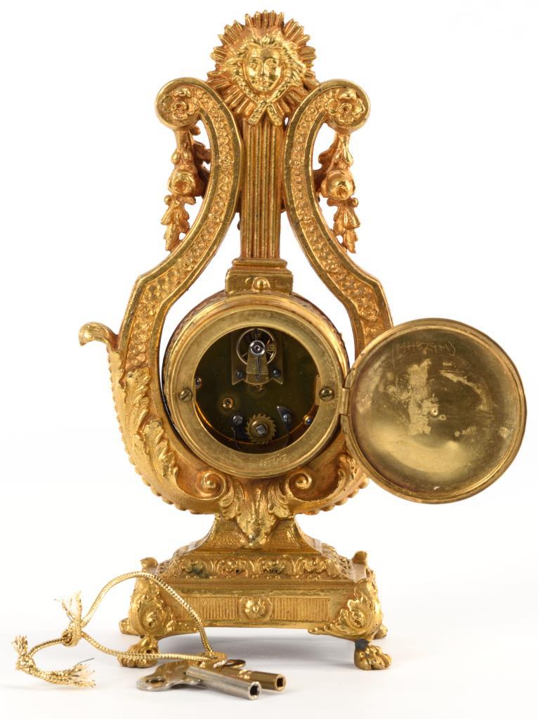 Metallguss, bronziert. Lyra-Uhr im Louis-Seize-Stil mit bekrönendem Sonnenkopf, Festonbehängung und quadratischem Sockel mit Tatzenfüßen. Werk läuft nicht.Leichte Alters- und Gebrauchsspuren, Lötspuren.