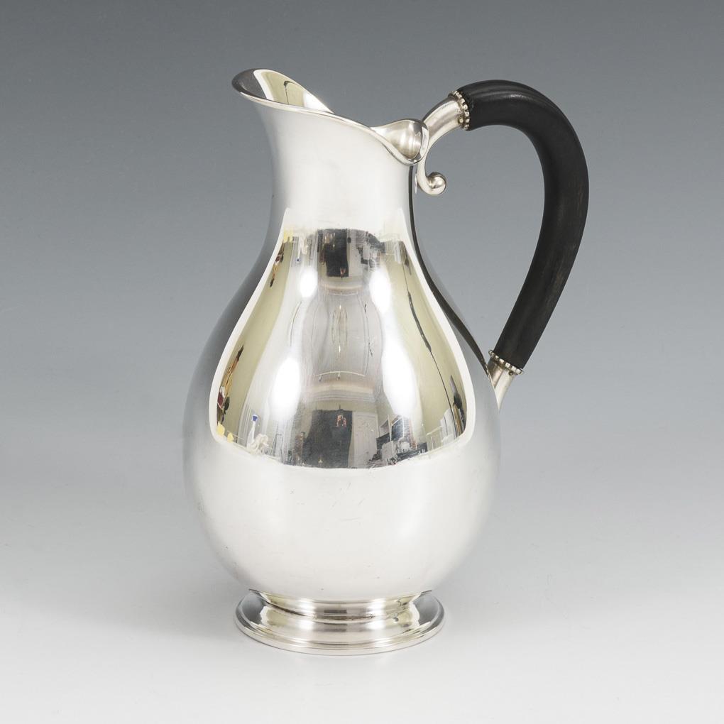 Bauchige Art-déco-Kanne mit Edelholzhenkel. Minimale Gebrauchsspuren.