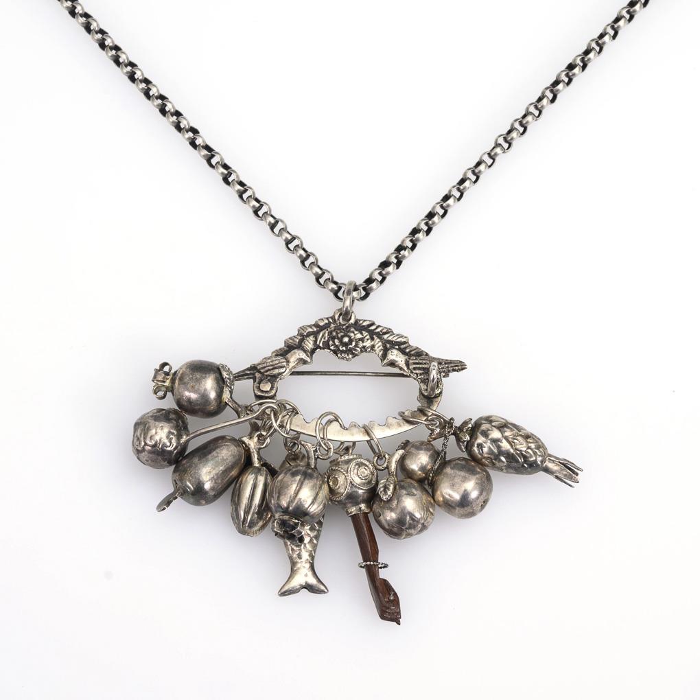 Reliefierte Brosche mit 10 Abhängungen (u.a. Fisch, Feigenhand, Ananas, Caju, Kakaofrucht, Kalebasse) an Erbskette. Hakenverschluss.