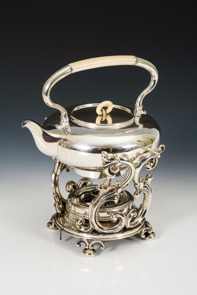 Bauchige Kanne auf wohl ergänztem, versilbertem Rechaud mit Ringbrenner. Kleine Dellen.