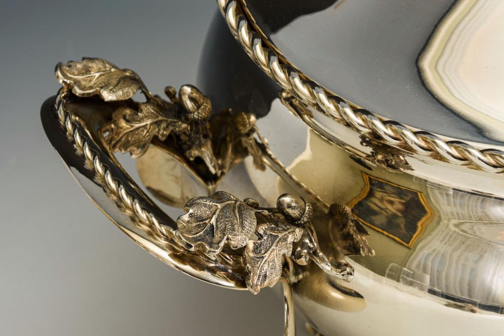 Schwere Terrine mit Kordelkante und plastischem Eichenblattdekor.