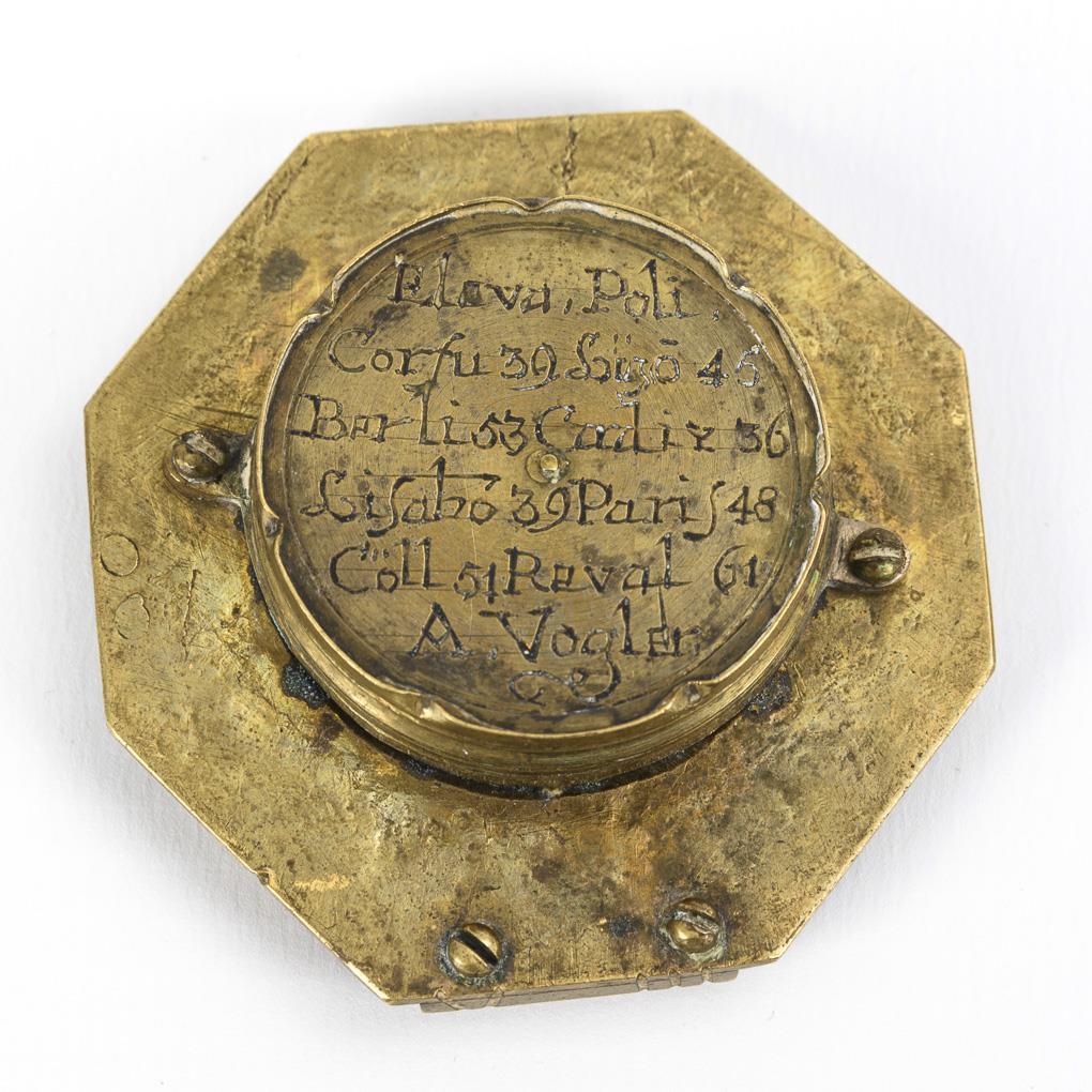 Zusammenlegbare Sonnenuhr mit fein gravierter oktogonaler Grundplatte und verglastem Kompass. Aufstellbarer Latitudo-Gradbogen, Äquatorialreif mit römischen Stundenmarken. Im Reif aufklappbarer Polstab als Schattenwerfer (Gnomon). Auf dem Boden des Kompasses gravierte Städtenamen (z.B. Korfu, Lissabon, Paris, Köln usw.) mit jeweiligem Breitengrad. Glasscheibe gesprungen, Bussolenboden berieben.