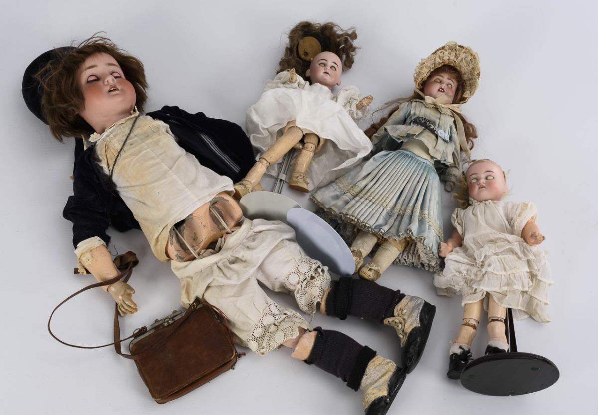 3x Kurbelkopf, 1x Brustkopf, alle mit Schlafaugen und Perücke. 3x mit mehrteiligem Gliederkörper, 1x mit Lederkörper und Unterarmen aus Biskuit. Helle Kleider. Köpfe in Ordnung, Körper mit teils starken Defekten, 1x locker gespannt.