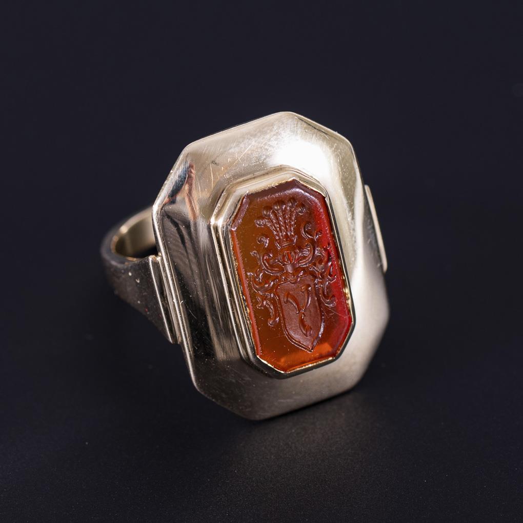 Zargengefasste Karneoltafel mit Wappengravur, in breitem Ringkopf zwischen mittlerer Schiene.