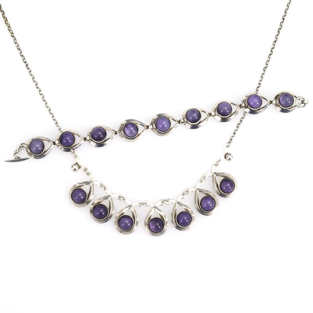 Collier und Armband mit violett hinterlegten Cabochons in geschlossenen Zargenfassungen. Ankerkette mit Ringfederschließe. Knebelschließe.
